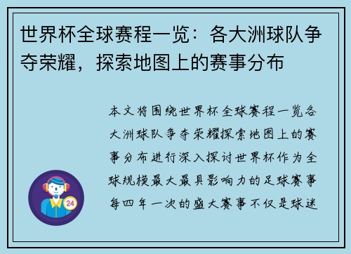 世界杯作为全球最盛大的足球赛事,吸引着世界各地亿万观众的关注。自1930年首届世界杯举办以来,每届世界杯都见证了足球历史的辉煌瞬间和各国足球强队的激烈角逐。在这一赛事的历程中,各国的表现和历史排名逐渐显现出不同的趋势与特点。本篇文章将从世界杯历届冠军、各国历史排名等多个方面对世界杯进行深入解析,重点分析历届冠军的情况、各国的夺冠历史、排名的变化及趋势、以及不同国家在不同年代的表现与贡献。通过这四个...