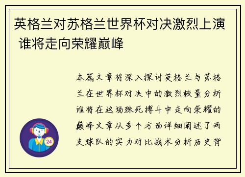 本文将深入探讨美国女排与俄罗斯队在世界杯关键对决中的巅峰对决,以及其中展现的精彩瞬间。两队在这场赛事中激烈碰撞,目标一致——力争世界杯冠军。本文从四个方面详细分析这场比赛的各个精彩环节,包括比赛的战略布局、球员的个人表现、战术对决中的关键时刻,以及比赛带来的巨大影响。通过对这些方面的剖析,读者将能够全面了解这场比赛为何被认为是世界杯历史上的经典之战。奇异果...